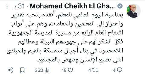 تقدم الرئيس محمد ولد الغزواني بتحية تقدير واعتزاز إلى المعلمين والمعلمات، بمناسبة اليوم العالمي ل
