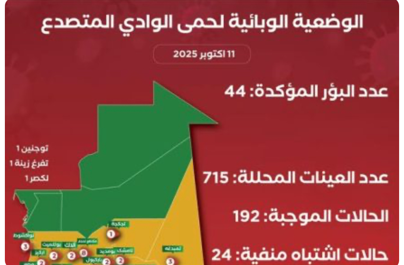 أعلنت السلطات الموريتانية ، تسجيل 44 بؤرة من حمى الوادي المتصدع موزعة على22 مقاطعة تتبع لعشر ولايات.