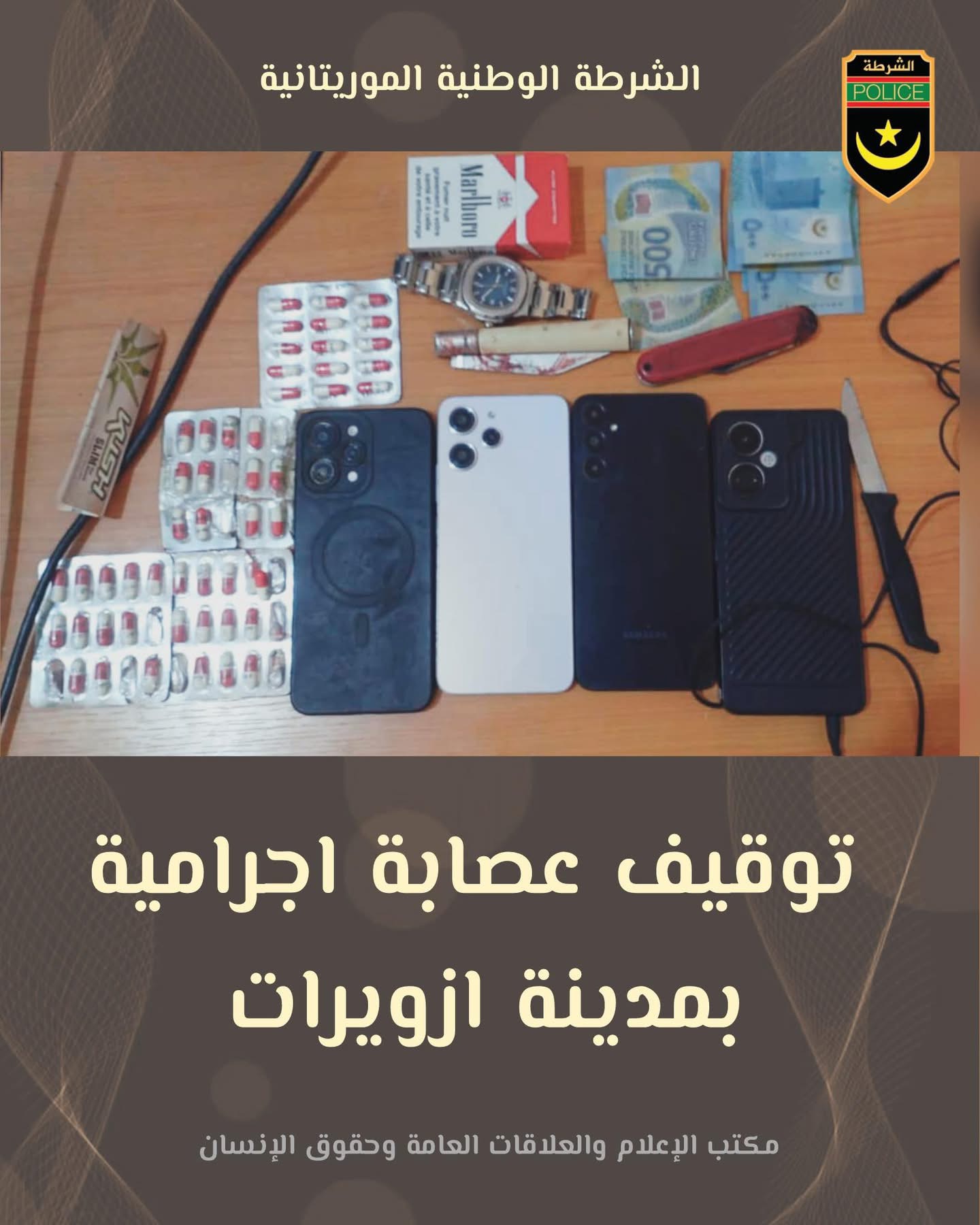 بناء على شكايات تقدم بها مواطنون تعرضوا للتهديد بالاعتداء بالسلاح الأبيض، وعلى إثر عمليات بحث مكثفة تمكنت مفوضية الشرطة بمدينة ازويرات يوم الخميس 15 يناير 2026 من توقيف عصابة اجرامية تتألف من أربعة من أصحاب السوابق، في المنزل الذي تتخذه العصابة وكرا لعملها الإجرامي حيث وجد افرادها في حالة تلبس بتعاطي مواد مخدرة، وقد ضبطت بحوزتهم كمية من حبوب لاريكا المهلوسة وكمية من حبوب لفترين وعلبة لفايف من لارزين.