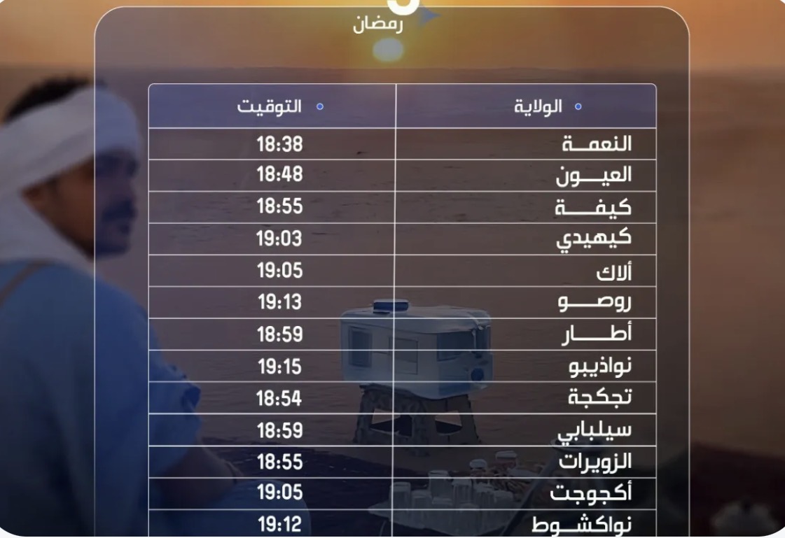 وهذه أوقات الإفطار في عواصم ولايات موريتانيا بالنسبة لليوم التاسع من شهر رمضان 1447 ه.