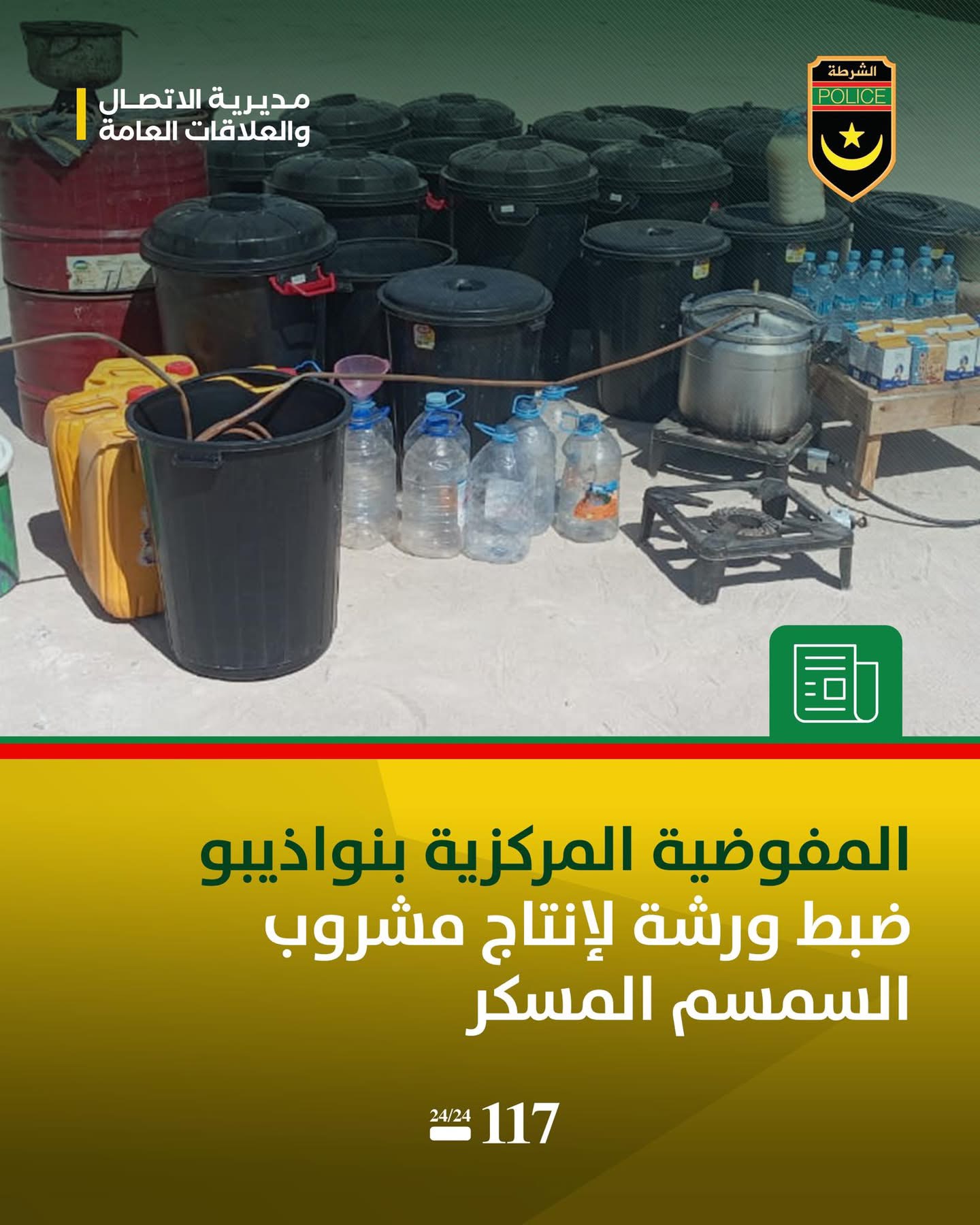 ضمن حصيلتها الأسبوعية تمكنت المفوضية المركزية التابعة للإدارة الجهوية للأمن بولاية داخلت نواذيبو، من تفكيك ورشة مخصصة لإنتاج مشروب السمسم المسكر، وذلك في إطار عمليات البحث الأمنية الهادفة إلى مكافحة المؤثرات العقلية.